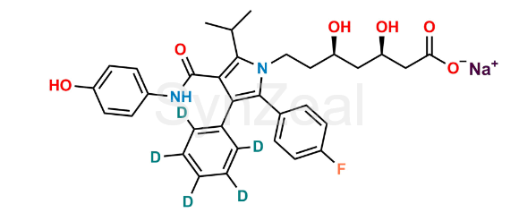 4-Hydroxy Atorvastatin D5 is chemically Sodium (3R,5R)-7-(2-(4-fluorophenyl)-4-((4-hydroxyphenyl)carbamoyl)-5-isopropyl-3-(phenyl-d5)-1H-pyrrol-1-yl)-3,5-dihydroxyheptanoate. It is also known as p-Hydroxyatorvastatin-d5 sodium salt. 4-Hydroxy Atorvastatin D5 is supplied with detailed characterization data compliant with regulatory guideline. 4-Hydroxy Atorvastatin D5 can be used for the analytical method development, method validation (AMV), Quality Controlled (QC) application for Abbreviated New Drug Application (ANDA) or during commercial production of Atorvastatin.