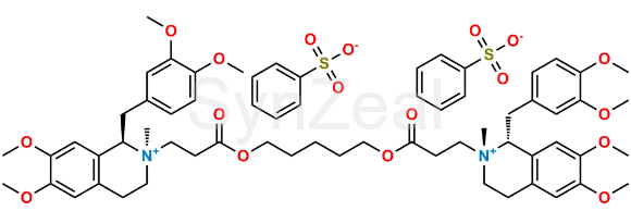 Nome Químico: 2,2′-[Pentane-1,5-diylbis[oxy(3-oxopropane-3,1-diyl)]]bis[(1R,2R)-1-[(3,4-dimethoxyphenyl)methyl]-6,7-dimethoxy-2-methyl-1,2,3,4-tetrahydroisoquinolinium] dibenzenesulfonate (as per EP); (1R,2R)-2-(2-Carboxyethyl)-1,2,3,4-tetrahydro-6,7-dimethoxy-2-methyl-1-veratrylisoquinolinium benzenesulfonate, pentamethylene ester (as per USP)