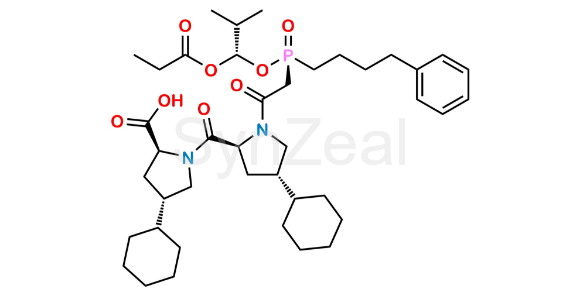 Nome Químico: (2S,4S)-4-Cyclohexyl-1-[[(2S,4S)-4-cyclohexyl-1-[[(R)-[(1S)-2-methyl-1-(1- oxopropoxy)propoxy](4phenylbutyl)phosphoryl]acetyl]pyrrolidin-2-yl]carbonyl]pyrrolidine-2-carboxylic acid