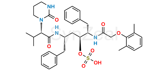 Lopinavir EP Impurity D is chemically (1R,3R)-1-[(1R)-1-[[2-(2,6-Dimethylphenoxy)acetyl]amino]-2-phenylethyl]-3-[[(2R)-3-methyl-2-[2-oxotetrahydropyrimidin-1(2H)-yl]butanoyl]amino]-4-phenylbutyl hydrogen sulfate (as per EP); . Lopinavir EP Impurity D is supplied with detailed characterization data compliant with regulatory guideline. Lopinavir EP Impurity D can be used for the analytical method development, method validation (AMV), Quality Controlled (QC) application for Abbreviated New Drug Application (ANDA) or during commercial production of Lopinavir.