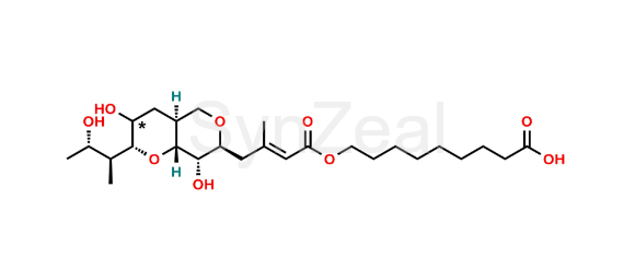 Mupirocin EP Impurity E is chemically 9-[[(2E)-4-[(2R,3RS,4aS,7S,8S,8aR)-3,8-dihydroxy-2-[(1S,2S)-2-hydroxy-1-methylpropyl]hexahydro2H,5H-pyrano[4,3-b]pyran-7-yl]-3-methylbut-2-enoyl]oxy]nonanoic acid (as per EP); 9-{(E)-4-[(2R,3RS,4aS,7S,8S,8aR)-3,8-Dihydroxy-2-{(2S,3S)-3-hydroxybutan-2-yl}octahydropyrano[3,2-c]pyran-7-yl]-3-methylbut-2-enoyloxy}nonanoic acid (as per USP). It is also known as Mupirocin Pyranyl Analog (USP) ; Mupirocin USP impurity 2 . Mupirocin EP Impurity E is supplied with detailed characterization data compliant with regulatory guideline. Mupirocin EP Impurity E can be used for the analytical method development, method validation (AMV), Quality Controlled (QC) application for Abbreviated New Drug Application (ANDA) or during commercial production of Mupirocin.