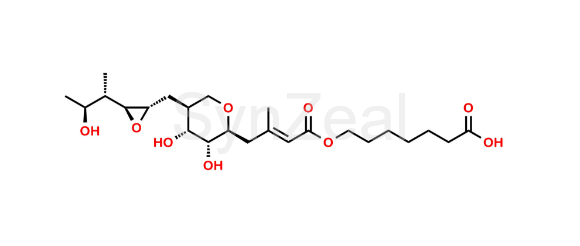 Mupirocin EP Impurity F is chemically 7-[[(2E)-4-[(2S,3R,4R,5S)-3,4-dihydroxy-5-[[(2S,3S)-3-[(1S,2S)-2-hydroxy-1-methylpropyl]oxiranyl] methyl]tetrahydro-2H-pyran-2-yl]-3-methylbut-2-enoyl]oxy]heptanoic acid (as per EP); 7-{(E)-4-[(2S,3R,4R,5S)-3,4-Dihydroxy-5-({(2S,3S)-3-[(2S,3S)-3-hydroxybutan-2-yl]oxiran-2-yl}methyl)tetrahydro-2H-pyran-2-yl]-3-methylbut-2-enoyl oxy}heptanoic acid (as per USP) . It is also known as Pseudomonic acid N (USP) ; Pseudomonic acid F (USP). Mupirocin EP Impurity F is supplied with detailed characterization data compliant with regulatory guideline. Mupirocin EP Impurity F can be used for the analytical method development, method validation (AMV), Quality Controlled (QC) application for Abbreviated New Drug Application (ANDA) or during commercial production of Mupirocin.
