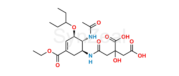 Oseltamivir Citric Acid Adduct is chemically 2-(2-(((1S,5R,6R)-6-acetamido-3-(ethoxycarbonyl)-5-(pentan-3-yloxy)cyclohex-3-en-1-yl)amino)-2-oxoethyl)-2-hydroxysuccinic acid. Oseltamivir Citric Acid Adduct is supplied with detailed characterization data compliant with regulatory guideline. Oseltamivir Citric Acid Adduct can be used for the analytical method development, method validation (AMV), Quality Controlled (QC) application for Abbreviated New Drug Application (ANDA) or during commercial production of Oseltamivir.