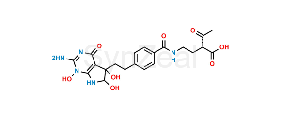 Pemetrexed Impurity 24 is chemically (2R)-2-Acetyl-4-(4-(2-(2-amino-1,5,6-trihydroxy-4-oxo-4,5,6,7-tetrahydro-1H-pyrrolo[2,3-d]pyrimidin-5-yl)ethyl)benzamido)butanoic acid. Pemetrexed Impurity 24 is supplied with detailed characterization data compliant with regulatory guideline. Pemetrexed Impurity 24 can be used for the analytical method development, method validation (AMV), Quality Controlled (QC) application for Abbreviated New Drug Application (ANDA) or during commercial production of Pemetrexed.