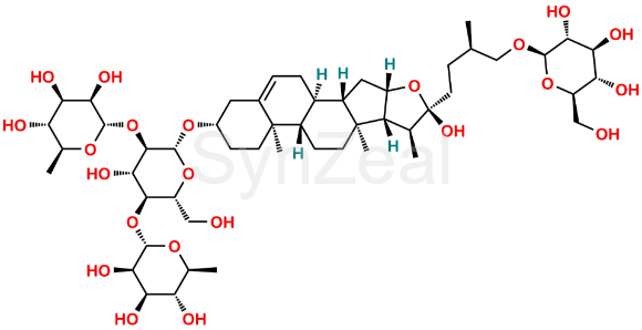 Protodioscin is chemically (2S,2'S,3R,3'R,4R,4'R,5R,5'R,6S,6'S)-6,6'-(((2R,3R,4S,5S,6R)-4-hydroxy-2-(((4S,6aR,6bS,8aS,8bR,9S,10R,11aS,12aS,12bS)-10-hydroxy-6a,8a,9-trimethyl-10-((R)-3-methyl-4-(((2R,3R,4S,5S,6R)-3,4,5-trihydroxy-6-(hydroxymethyl)tetrahydro-2H-pyran-2-yl)oxy)butyl)-3,4,5,6,6a,6b,7,8,8a,8b,9,10,11a,12,12a,12b-hexadecahydro-1H-naphtho[2',1':4,5]indeno[2,1-b]furan-4-yl)oxy)-6-(hydroxymethyl)tetrahydro-2H-pyran-3,5-diyl)bis(oxy))bis(2-methyltetrahydro-2H-pyran-3,4,5-triol). Protodioscin is supplied with detailed characterization data compliant with regulatory guideline. Protodioscin can be used for the analytical method development, method validation (AMV), Quality Controlled (QC) application for Abbreviated New Drug Application (ANDA) or during commercial production of Miscellaneous-2.