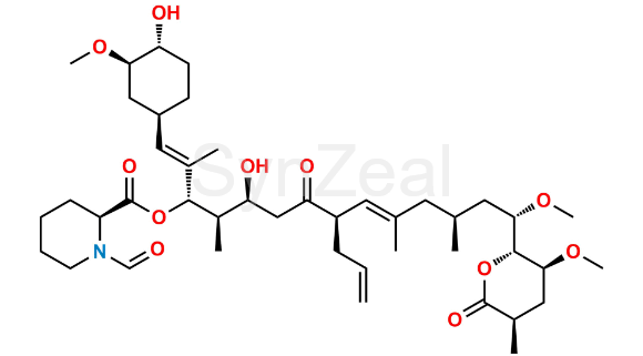 Tacrolimus EP Impurity H is chemically (1E,3S,4R,5S,8R,9E,12S,14S)-5-Hydroxy-1-[(1R,3R,4R)-4-hydroxy-3-methoxycyclohexyl]-14-methoxy-14-[(2R,3S,5R)-3-methoxy-5-methyl-6-oxooxan-2-yl]-2,4,10,12-tetramethyl-7-oxo-8-(prop-2-en-1-yl)tetradeca-1,9-dien-3-yl (2S)-1-formylpiperidine-2- carboxylate (as per EP). Tacrolimus EP Impurity H is supplied with detailed characterization data compliant with regulatory guideline. Tacrolimus EP Impurity H can be used for the analytical method development, method validation (AMV), Quality Controlled (QC) application for Abbreviated New Drug Application (ANDA) or during commercial production of Tacrolimus.