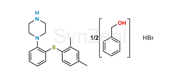 Vortioxetine Hemi Benzyl Alcohol Hydrobromide is chemically Phenylmethanol compound with 1-(2-((2,4-dimethylphenyl)thio)phenyl)piperazine hydrobromide (1:2). Vortioxetine Hemi Benzyl Alcohol Hydrobromide is supplied with detailed characterization data compliant with regulatory guideline. Vortioxetine Hemi Benzyl Alcohol Hydrobromide can be used for the analytical method development, method validation (AMV), Quality Controlled (QC) application for Abbreviated New Drug Application (ANDA) or during commercial production of Vortioxetine.