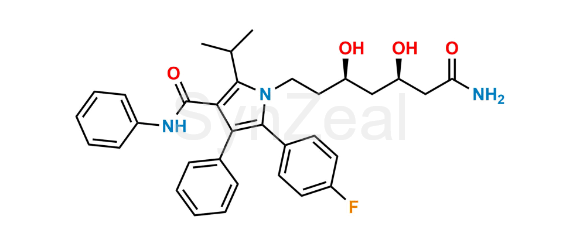 (3R,5R)-Atorvastatin Amide is chemically 1-((3R,5R)-7-amino-3,5-dihydroxy-7-oxoheptyl)-5-(4-fluorophenyl)-2-isopropyl-N,4-diphenyl-1H-pyrrole-3-carboxamide. (3R,5R)-Atorvastatin Amide is supplied with detailed characterization data compliant with regulatory guideline. (3R,5R)-Atorvastatin Amide can be used for the analytical method development, method validation (AMV), Quality Controlled (QC) application for Abbreviated New Drug Application (ANDA) or during commercial production of Atorvastatin.