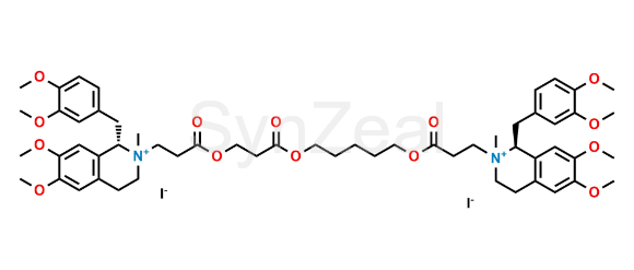 Atracurium Impurity 2 (Iodide salt) is chemically (1S)-1-(3,4-Dimethoxybenzyl)-2-(3-(3-((5-((3-((1S)-1-(3,4-dimethoxybenzyl)-6,7-dimethoxy-2-methyl-1,2,3,4-tetrahydroisoquinolin-2-ium-2-yl)propanoyl)oxy)pentyl)oxy)-3-oxopropoxy)-3-oxopropyl)-6,7-dimethoxy-2-methyl-1,2,3,4-tetrahydroisoquinolin-2-ium iodide. Atracurium Impurity 2 (Iodide salt) is supplied with detailed characterization data compliant with regulatory guideline. Atracurium Impurity 2 (Iodide salt) can be used for the analytical method development, method validation (AMV), Quality Controlled (QC) application for Abbreviated New Drug Application (ANDA) or during commercial production of Atracurium.