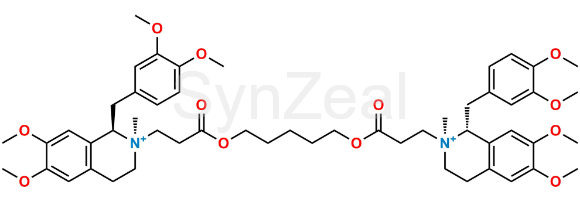 Cisatracurium EP Impurity H is chemically (1R,1`R,2R,2`S)-2,2`-[Pentane-1,5-diylbis[oxy(3-oxopropane-3,1-diyl)]]bis[1-[(3,4-dimethoxyphenyl)-methyl]-6,7-dimethoxy-2-methyl-1,2,3,4-tetrahydroisoquinolinium] (as per EP);(1R,1′R,2R,2′S)-2,2′-(3,11-Dioxo-4,10-dioxatridecamethylene)bis(1,2,3,4-tetrahydro-6,7-dimethoxy-2-methyl-1-veratrylisoquinolinium) (as per USP). It is also known as R-cis-R′-trans-Atracurium. Cisatracurium EP Impurity H is supplied with detailed characterization data compliant with regulatory guideline. Cisatracurium EP Impurity H can be used for the analytical method development, method validation (AMV), Quality Controlled (QC) application for Abbreviated New Drug Application (ANDA) or during commercial production of Cisatracurium.