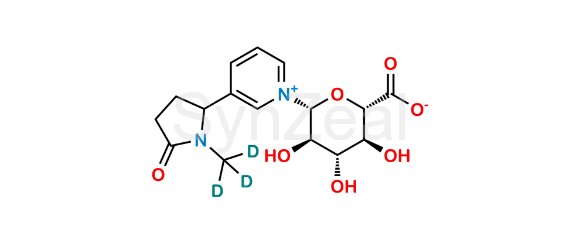 Cotinine D3 N-b-D-Glucuronide (Mixture of Diastereomers) is chemically (2S,3S,4S,5R,6R)-3,4,5-Trihydroxy-6-(3-(1-(methyl-d3)-5-oxopyrrolidin-2-yl)pyridin-1-ium-1-yl)tetrahydro-2H-pyran-2-carboxylate. Cotinine D3 N-b-D-Glucuronide (Mixture of Diastereomers) is supplied with detailed characterization data compliant with regulatory guideline. Cotinine D3 N-b-D-Glucuronide (Mixture of Diastereomers) can be used for the analytical method development, method validation (AMV), Quality Controlled (QC) application for Abbreviated New Drug Application (ANDA) or during commercial production of Nicotine.