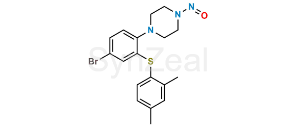 N-Nitroso Vortioxetine Impurity 2 is chemically 1-(4-Bromo-2-((2,4-dimethylphenyl)thio)phenyl)-4-nitrosopiperazine. N-Nitroso Vortioxetine Impurity 2 is supplied with detailed characterization data compliant with regulatory guideline. N-Nitroso Vortioxetine Impurity 2 can be used for the analytical method development, method validation (AMV), Quality Controlled (QC) application for Abbreviated New Drug Application (ANDA) or during commercial production of Vortioxetine.