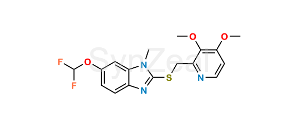 Pantoprazole Sulfide N-Methyl 6-Difluoromethoxy Analog is chemically 6-(Difluoromethoxy)-2-(((3,4-dimethoxypyridin-2-yl)methyl)thio)-1-methyl-1H-benzo[d]imidazole. Pantoprazole Sulfide N-Methyl 6-Difluoromethoxy Analog is supplied with detailed characterization data compliant with regulatory guideline. Pantoprazole Sulfide N-Methyl 6-Difluoromethoxy Analog can be used for the analytical method development, method validation (AMV), Quality Controlled (QC) application for Abbreviated New Drug Application (ANDA) or during commercial production of Pantoprazole.
