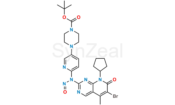 Palbociclib N-BOC 6-Bromo Analog Nitroso Impurity is chemically Tert-butyl 4-(6-((6-bromo-8-cyclopentyl-5-methyl-7-oxo-7,8-dihydropyrido[2,3-d]pyrimidin-2-yl)(nitroso)amino)pyridin-3-yl)piperazine-1-carboxylate. Palbociclib N-BOC 6-Bromo Analog Nitroso Impurity is supplied with detailed characterization data compliant with regulatory guideline. Palbociclib N-BOC 6-Bromo Analog Nitroso Impurity can be used for the analytical method development, method validation (AMV), Quality Controlled (QC) application for Abbreviated New Drug Application (ANDA) or during commercial production of Palbociclib.