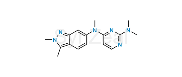 Pazopanib Impurity 29 is chemically N4-(2,3-dimethyl-2H-indazol-6-yl)-N2,N2,N4-trimethylpyrimidine-2,4-diamine. Pazopanib Impurity 29 is supplied with detailed characterization data compliant with regulatory guideline. Pazopanib Impurity 29 can be used for the analytical method development, method validation (AMV), Quality Controlled (QC) application for Abbreviated New Drug Application (ANDA) or during commercial production of Pazopanib.