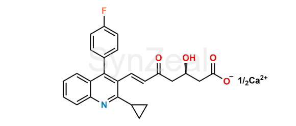 Pitavastatin 5-Oxo Impurity Calcium Salt is chemically Calcium (R,E)-7-(2-cyclopropyl-4-(4-fluorophenyl)quinolin-3-yl)-3-hydroxy-5-oxohept-6-enoate. It is also known as Pitavastatin Ketone Impurity. Pitavastatin 5-Oxo Impurity Calcium Salt is supplied with detailed characterization data compliant with regulatory guideline. Pitavastatin 5-Oxo Impurity Calcium Salt can be used for the analytical method development, method validation (AMV), Quality Controlled (QC) application for Abbreviated New Drug Application (ANDA) or during commercial production of Pitavastatin.
