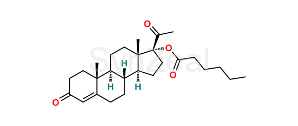 Hydroxyprogesterone Caproate is chemically Pregn-4-ene-3,20-dione, 17-[(1-oxohexyl)oxy]-; Pregn-4-ene-3,20-dione, 17-hydroxy-, hexanoate (7CI,8CI); Progesterone, 17-hydroxy-, hexanoate (6CI); 17-[(1-Oxohexyl)oxy]pregn-4-ene-3,20-dione; Hexanoic acid, ester with 17-hydroxypregn-4-ene-3,20-dione (8CI); 17-Caproxyprogesterone; 17α-Caproyloxy-P4; 17α-Caproyloxypregn-4-ene-3,20-dione; 17α-Caproyloxyprogesterone17α-Hydroxypregn-4-ene-3,20-dione caproate; 17α-Hydroxypregn-4-ene-3,20-dione hexanoate; 17α-Hydroxyprogesterone caproate; 17α-Hydroxyprogesterone hexanoate; 17α-Hydroxyprogesterone n-caproate; 3,20-Dioxopregn-4-en-17α-yl caproate; Delalutin; Depo-proluton; HPC; Hormofort; Hydroxyprogesterone caproate; Hydroxyprogesterone hexanoate; Hyproval PA; Lewntogest; NSC 17592; Neolutin; Pharlon; Primolut Depot; Procyte Depo; Proge; Progesterone caproate; Proluton Depot; Syngynon; Teralutil. It is also known as 17-alpha-Hydroxy Progesterone Caproate. Hydroxyprogesterone Caproate is supplied with detailed characterization data compliant with regulatory guideline. Hydroxyprogesterone Caproate can be used for the analytical method development, method validation (AMV), Quality Controlled (QC) application for Abbreviated New Drug Application (ANDA) or during commercial production of Progesterone.