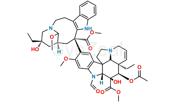 Nome Químico: methyl (3aR,3a1S,4R,5S,5aR)-4-acetoxy-3a-ethyl-9-((5S,7S,9S)-5-ethyl-5-hydroxy-15-methoxy-9-(Methoxycarbonyl)-1,4,5,6,7,8,9,10-octahydro-2H-3,7-methano[1]azacycloundecino[5,4-b]indol-9-yl)-6-formyl-5-hydroxy-8-methoxy-3a,3a1,4,5,5a,6,11,12-octahydro-1H-indolizino[8,1-cd]carbazole-5-carboxylate