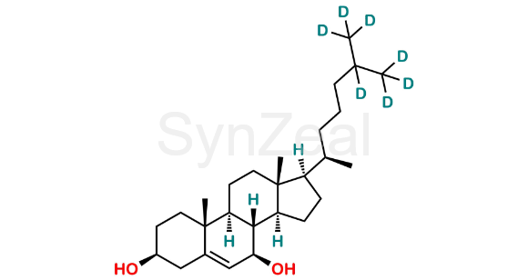 7-Beta Hydroxy Cholesterol D7 is chemically (3S,7R,8S,9S,10R,13R,14S,17R)-10,13-dimethyl-17-((R)-6-(methyl-d3)heptan-2-yl-6,7,7,7-d4)-2,3,4,7,8,9,10,11,12,13,14,15,16,17-tetradecahydro-1H-cyclopenta[a]phenanthrene-3,7-diol. 7-Beta Hydroxy Cholesterol D7 is supplied with detailed characterization data compliant with regulatory guideline. 7-Beta Hydroxy Cholesterol D7 can be used for the analytical method development, method validation (AMV), Quality Controlled (QC) application for Abbreviated New Drug Application (ANDA) or during commercial production of Cholesterol.