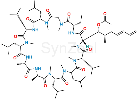 Acetyl Voclosporin is chemically (1R,2R,E)-1-((2S,5S,11S,14S,17S,20S,23R,26S,29S,32S)-5-ethyl-11,17,26,29-tetraisobutyl-14,32-diisopropyl-1,7,10,16,20,23,25,28,31-nonamethyl-3,6,9,12,15,18,21,24,27,30,33-undecaoxo-1,4,7,10,13,16,19,22,25,28,31-undecaazacyclotritriacontan-2-yl)-2-methylhepta-4,6-dien-1-yl acetate. Acetyl Voclosporin is supplied with detailed characterization data compliant with regulatory guideline. Acetyl Voclosporin can be used for the analytical method development, method validation (AMV), Quality Controlled (QC) application for Abbreviated New Drug Application (ANDA) or during commercial production of Cyclosporin.