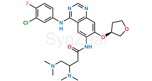 Afatinib Bis-dimethylamino Impurity is chemically N-(4-((3-chloro-4-fluorophenyl)amino)-7-(((S)-tetrahydrofuran-3-yl)oxy)quinazolin-6-yl)-3,4-bis(dimethylamino)butanamide. Afatinib Bis-dimethylamino Impurity is supplied with detailed characterization data compliant with regulatory guideline. Afatinib Bis-dimethylamino Impurity can be used for the analytical method development, method validation (AMV), Quality Controlled (QC) application for Abbreviated New Drug Application (ANDA) or during commercial production of Afatinib.
