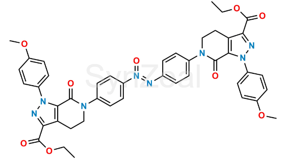 Apixaban Impurity 39 is chemically (Z)-1,2-Bis(4-(3-(ethoxycarbonyl)-1-(4-methoxyphenyl)-7-oxo-1,4,5,7-tetrahydro-6H-pyrazolo[3,4-c]pyridin-6-yl)phenyl)diazene 1-oxide. Apixaban Impurity 39 is supplied with detailed characterization data compliant with regulatory guideline. Apixaban Impurity 39 can be used for the analytical method development, method validation (AMV), Quality Controlled (QC) application for Abbreviated New Drug Application (ANDA) or during commercial production of Apixaban.
