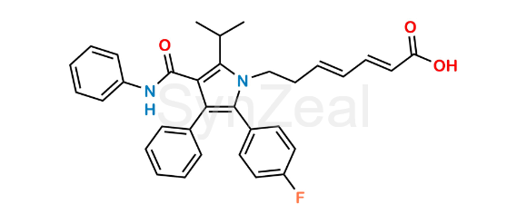 Atorvastatin 2,3,4,5-Dianhydro Acid is chemically (2E,4E)-7-(2-(4-fluorophenyl)-5-isopropyl-3-phenyl-4-(phenylcarbamoyl)-1H-pyrrol-1-yl)hepta-2,4-dienoic acid. Atorvastatin 2,3,4,5-Dianhydro Acid is supplied with detailed characterization data compliant with regulatory guideline. Atorvastatin 2,3,4,5-Dianhydro Acid can be used for the analytical method development, method validation (AMV), Quality Controlled (QC) application for Abbreviated New Drug Application (ANDA) or during commercial production of Atorvastatin.