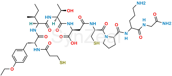 Atosiban Impurity D is chemically N4-((2R)-1-((2S)-2-((5-amino-1-((2-amino-2-oxoethyl)amino)-1-oxopentan-2-yl)carbamoyl)pyrrolidin-1-yl)-3-mercapto-1-oxopropan-2-yl)-N2-((R)-3-(4-ethoxyphenyl)-2-(3-mercaptopropanamido)propanoyl)-L-isoleucyl-L-threonyl-L-asparagine. Atosiban Impurity D is supplied with detailed characterization data compliant with regulatory guideline. Atosiban Impurity D can be used for the analytical method development, method validation (AMV), Quality Controlled (QC) application for Abbreviated New Drug Application (ANDA) or during commercial production of Atosiban.