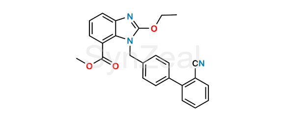 Azilsartan Impurity 1 is chemically Methyl 1-((2'-cyano-[1,1'-biphenyl]-4-yl)methyl)-2-ethoxy-1H-benzo[d]imidazole-7-carboxylate. Azilsartan Impurity 1 is supplied with detailed characterization data compliant with regulatory guideline. Azilsartan Impurity 1 can be used for the analytical method development, method validation (AMV), Quality Controlled (QC) application for Abbreviated New Drug Application (ANDA) or during commercial production of Azilsartan.