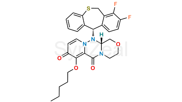 Baloxavir Impurity 18 is chemically (R)-12-((S)-7,8-difluoro-6,11-dihydrodibenzo[b,e]thiepin-11-yl)-7-(pentyloxy)-3,4,12,12a-tetrahydro-1H-[1,4]oxazino[3,4-c]pyrido[2,1-f][1,2,4]triazine-6,8-dione. Baloxavir Impurity 18 is supplied with detailed characterization data compliant with regulatory guideline. Baloxavir Impurity 18 can be used for the analytical method development, method validation (AMV), Quality Controlled (QC) application for Abbreviated New Drug Application (ANDA) or during commercial production of Baloxavir marboxil.