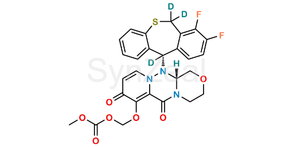 Baloxavir Marboxil D3 is chemically (((R)-12-((S)-7,8-difluoro-6,11-dihydrodibenzo[b,e]thiepin-11-yl-6,6,11-d3)-6,8-dioxo-3,4,6,8,12,12a-hexahydro-1H-[1,4]oxazino[3,4-c]pyrido[2,1-f][1,2,4]triazin-7-yl)oxy)methyl methyl carbonate. Baloxavir Marboxil D3 is supplied with detailed characterization data compliant with regulatory guideline. Baloxavir Marboxil D3 can be used for the analytical method development, method validation (AMV), Quality Controlled (QC) application for Abbreviated New Drug Application (ANDA) or during commercial production of Baloxavir marboxil.