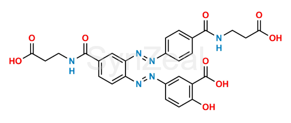 Balsalazide USP Impurity 3 is chemically 5-((E)-(4-((2-Carboxyethyl)carbamoyl)-2-((E)-(4-((2-carboxyethyl)carbamoyl)phenyl)diazenyl)phenyl)diazenyl)-2-hydroxybenzoic acid. Balsalazide USP Impurity 3 is supplied with detailed characterization data compliant with regulatory guideline. Balsalazide USP Impurity 3 can be used for the analytical method development, method validation (AMV), Quality Controlled (QC) application for Abbreviated New Drug Application (ANDA) or during commercial production of Balsalazide.