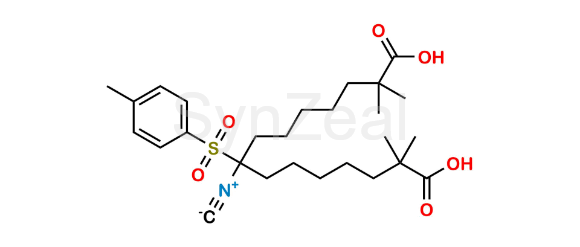 Bempedoic Acid Impurity 51 is chemically 8-Isocyano-2,2,14,14-tetramethyl-8-tosylpentadecanedioic acid. Bempedoic Acid Impurity 51 is supplied with detailed characterization data compliant with regulatory guideline. Bempedoic Acid Impurity 51 can be used for the analytical method development, method validation (AMV), Quality Controlled (QC) application for Abbreviated New Drug Application (ANDA) or during commercial production of Bempedoic Acid.