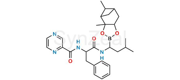 Bortezomib Impurity 43 is chemically Pyrazine-2-carboxylic acid (1-[3-methyl-1-(2,9-dimethyl-3,5-dioxa-4-bora-tricyclo[6.1.1.0.2.6]dec-4-yl)-butylcarbamoyl]-2-phenyl-ethyl)-amide. Bortezomib Impurity 43 is supplied with detailed characterization data compliant with regulatory guideline. Bortezomib Impurity 43 can be used for the analytical method development, method validation (AMV), Quality Controlled (QC) application for Abbreviated New Drug Application (ANDA) or during commercial production of Bortezomib.