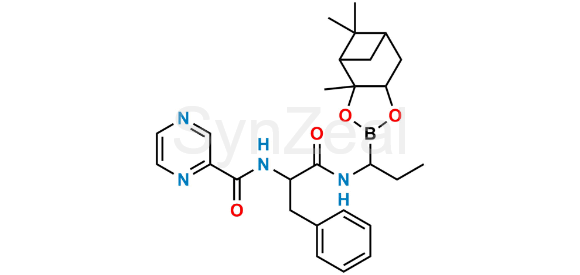 Bortezomib Impurity 51 is chemically N-(1-Oxo-3-phenyl-1-((1-(3a,5,5-trimethylhexahydro-4,6-methanobenzo[d][1,3,2]dioxaborol-2-yl)propyl)amino)propan-2-yl)pyrazine-2-carboxamide. Bortezomib Impurity 51 is supplied with detailed characterization data compliant with regulatory guideline. Bortezomib Impurity 51 can be used for the analytical method development, method validation (AMV), Quality Controlled (QC) application for Abbreviated New Drug Application (ANDA) or during commercial production of Bortezomib.