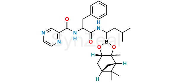 Bortezomib Impurity 79 is chemically N-(1-((3-Methyl-1-((3aS,4S,6S,7aS)-3a,5,5-trimethylhexahydro-4,6-methanobenzo[d][1,3,2]dioxaborol-2-yl)butyl)amino)-1-oxo-3-phenylpropan-2-yl)pyrazine-2-carboxamide. Bortezomib Impurity 79 is supplied with detailed characterization data compliant with regulatory guideline. Bortezomib Impurity 79 can be used for the analytical method development, method validation (AMV), Quality Controlled (QC) application for Abbreviated New Drug Application (ANDA) or during commercial production of Bortezomib.