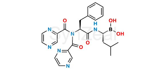 Bortezomib Impurity 8 is chemically ((R)-3-Methyl-1-((S)-3-phenyl-2-(N-(pyrazine-2-carbonyl)pyrazine-2-carboxamido)propanamido)butyl)boronic acid. Bortezomib Impurity 8 is supplied with detailed characterization data compliant with regulatory guideline. Bortezomib Impurity 8 can be used for the analytical method development, method validation (AMV), Quality Controlled (QC) application for Abbreviated New Drug Application (ANDA) or during commercial production of Bortezomib.