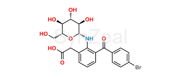 Bromfenac N-β-D-Glucoside is chemically 2-(3-(4-Bromobenzoyl)-2-(((2R,3R,4S,5S,6R)-3,4,5-trihydroxy-6-(hydroxymethyl)tetrahydro-2H-pyran-2-yl)amino)phenyl)acetic acid. Bromfenac N-β-D-Glucoside is supplied with detailed characterization data compliant with regulatory guideline. Bromfenac N-β-D-Glucoside can be used for the analytical method development, method validation (AMV), Quality Controlled (QC) application for Abbreviated New Drug Application (ANDA) or during commercial production of Bromfenac.