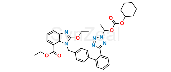 Candesartan Ethyl Ester N2-Cilexetil Analog is chemically Ethyl 1-({2'-[1-(1-{[(cyclohexyloxy) carbonyl] oxy} ethyl)-2H-tetrazol-5-yl] biphenyl-4-yl} methyl)-2-ethoxy-1H-benzimidazole-7-carboxylate ;. It is also known as Candesartan N2-Cilexetil Ethyl Ester ; . Candesartan Ethyl Ester N2-Cilexetil Analog is supplied with detailed characterization data compliant with regulatory guideline. Candesartan Ethyl Ester N2-Cilexetil Analog can be used for the analytical method development, method validation (AMV), Quality Controlled (QC) application for Abbreviated New Drug Application (ANDA) or during commercial production of Candesartan.