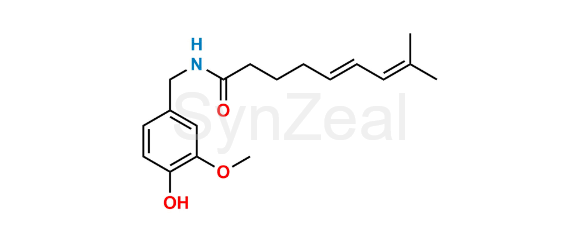 Capsaicin Impurity 1 is chemically (E)-N-(4-Hydroxy-3-methoxybenzyl)-8-methylnona-5,7-dienamide. Capsaicin Impurity 1 is supplied with detailed characterization data compliant with regulatory guideline. Capsaicin Impurity 1 can be used for the analytical method development, method validation (AMV), Quality Controlled (QC) application for Abbreviated New Drug Application (ANDA) or during commercial production of Capsaicin.