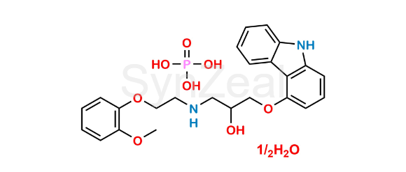Nome Químico: (2RS)-1-(9H-Carbazol-4-yloxy)-3-[[2-(2-methoxyphenoxy)ethyl]amino]propan-2-ol phosphate hemihydrate (as per EP) ; (±)-1-(Carbazol-4-yloxy)-3-[[2-(o-methoxyphenoxy)eth yl]amino]-2-propanol phosphate hemihydrate (as per USP)