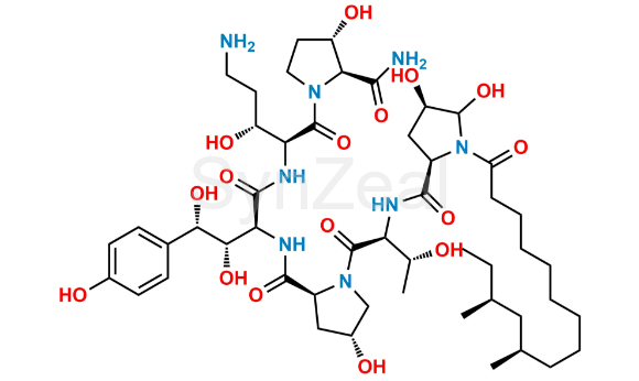 Nome Químico: ((2R,4R)-N-((2S)-1-((2S,4R)-2-((2S,3S,4S)-1-((2S,3R)-5-Amino-1-((2S,3S)-2-carbamoyl-3-hydroxypyrrolidin-1-yl)-3-hydroxy-1-oxopentan-2-ylamino)-3,4-dihydroxy-4-(4-hydroxyphenyl)-1-oxobutan-2-ylcarbamoyl)-4-hydroxypyrrolidin-1-yl)-3-hydroxy-1-oxobutan-2-yl)-1-(10,12-dimethyltetradecanoyl)-4,5-dihydroxypyrrolidine-2-carboxamide
