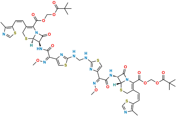 Cefditoren Pivoxil Dimer is chemically Bis((pivaloyloxy)methyl) 7,7'-(((2Z,2'Z)-2,2'-((methylenebis(azanediyl))bis(thiazole-2,4-diyl))bis(2-(methoxyimino)acetyl))bis(azanediyl))(6R,6'R,7R,7'R)-bis(3-((Z)-2-(4-methylthiazol-5-yl)vinyl)-8-oxo-5-thia-1-azabicyclo[4.2.0]oct-2-ene-2-carboxylate). Cefditoren Pivoxil Dimer is supplied with detailed characterization data compliant with regulatory guideline. Cefditoren Pivoxil Dimer can be used for the analytical method development, method validation (AMV), Quality Controlled (QC) application for Abbreviated New Drug Application (ANDA) or during commercial production of Cefditoren Pivoxil.