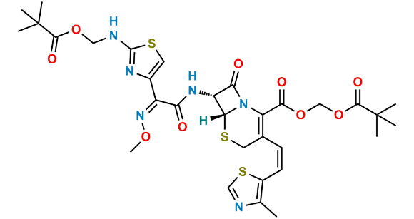 Nome Químico: (Pivaloyloxy)methyl (6R,7R)-7-((Z)-2-(methoxyimino)-2-(2-(((pivaloyloxy)methyl)amino)thiazol-4-yl)acetamido)-3-((Z)-2-(4-methylthiazol-5-yl)vinyl)-8-oxo-5-thia-1-azabicyclo[4.2.0]oct-2-ene-2-carboxylate