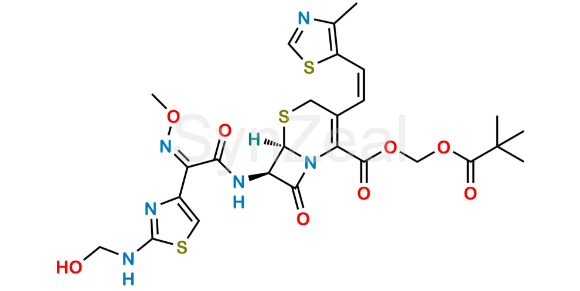 Nome Químico: (Pivaloyloxy)methyl (6R,7R)-7-((Z)-2-(2-((hydroxymethyl)amino)thiazol-4-yl)-2-(methoxyimino)acetamido)-3-((Z)-2-(4-methylthiazol-5-yl)vinyl)-8-oxo-5-thia-1-azabicyclo[4.2.0]oct-2-ene-2-carboxylate
