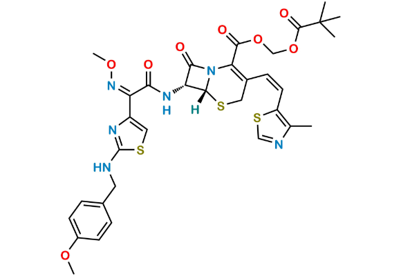 Nome Químico: (Pivaloyloxy)methyl (6R,7R)-7-((Z)-2-(2-((4-methoxybenzyl)amino)thiazol-4-yl)-2-(methoxyimino)acetamido)-3-((Z)-2-(4-methylthiazol-5-yl)vinyl)-8-oxo-5-thia-1-azabicyclo[4.2.0]oct-2-ene-2-carboxylate