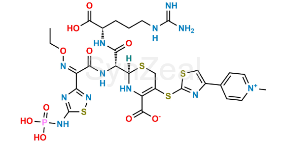 Nome Químico: (R)-2-((6S,9R,Z)-1-amino-6-carboxy-1-imino-8,11-dioxo-12-(5-(phosphonoamino)-1,2,4-thiadiazol-3-yl)-14-oxa-2,7,10,13-tetraazahexadec-12-en-9-yl)-5-((4-(1-methylpyridin-1-ium-4-yl)thiazol-2-yl)thio)-3,6-dihydro-2H-1,3-thiazine-4-carboxylate