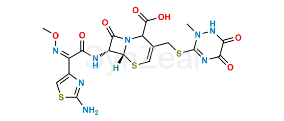 Nome Químico: (6R,7R)-7-[(Z)-2-(2-Aminothiazol-4-yl)-2-(methoxyimino)acetamido]-3-{[(6-hydroxy-2-methyl-5-oxo-2,5-dihydro-1,2,4-triazin-3-yl)thio]methyl}-8-oxo-5-thia-1-azabicyclo[4.2.0]oct-3-ene-2-carboxylic acid (as per USP)