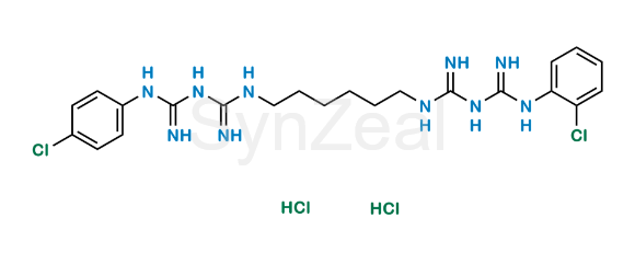 Chlorhexidine EP Impurity O (2HCl) is chemically N-[6-[[N-[N-(2-chlorophenyl)carbamimidoyl]carbamimidoyl]amino]hexyl]-N-(4-chlorophenyl)imidodicarbonimidic diamide dihydrochloride (as per EP). Chlorhexidine EP Impurity O (2HCl) is supplied with detailed characterization data compliant with regulatory guideline. Chlorhexidine EP Impurity O (2HCl) can be used for the analytical method development, method validation (AMV), Quality Controlled (QC) application for Abbreviated New Drug Application (ANDA) or during commercial production of Chlorhexidine.