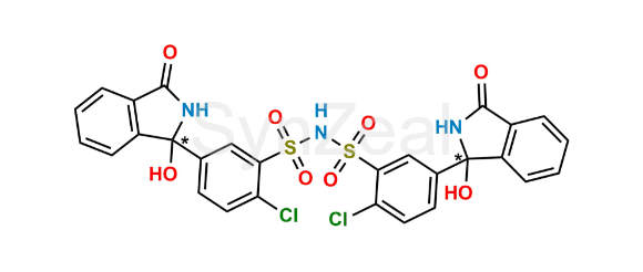 Chlortalidone EP Impurity F is chemically (11Ξ,71Ξ)-24,66-dichloro-11,71-dihydroxy-12,13,72,73-tetrahydro-11H,71H-3λ6,5λ6-dithia-4-aza-1,7(1)-diisoindola-2,6(1,3)-dibenzaheptaphan-13,3,3,5,5,73-hexone (as per EP). It is also known as Chlorthalidone Dimer . Chlortalidone EP Impurity F is supplied with detailed characterization data compliant with regulatory guideline. Chlortalidone EP Impurity F can be used for the analytical method development, method validation (AMV), Quality Controlled (QC) application for Abbreviated New Drug Application (ANDA) or during commercial production of Chlortalidone.
